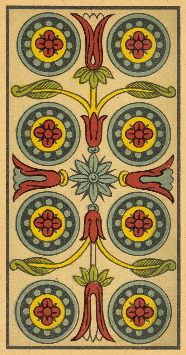 This unique piece belongs to the tradition of Tarot de Besançon—from the name of the French town where these kinds of cards were originally printed.