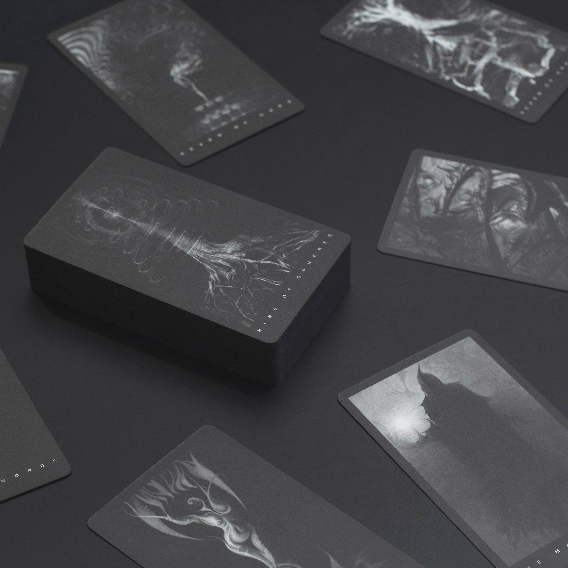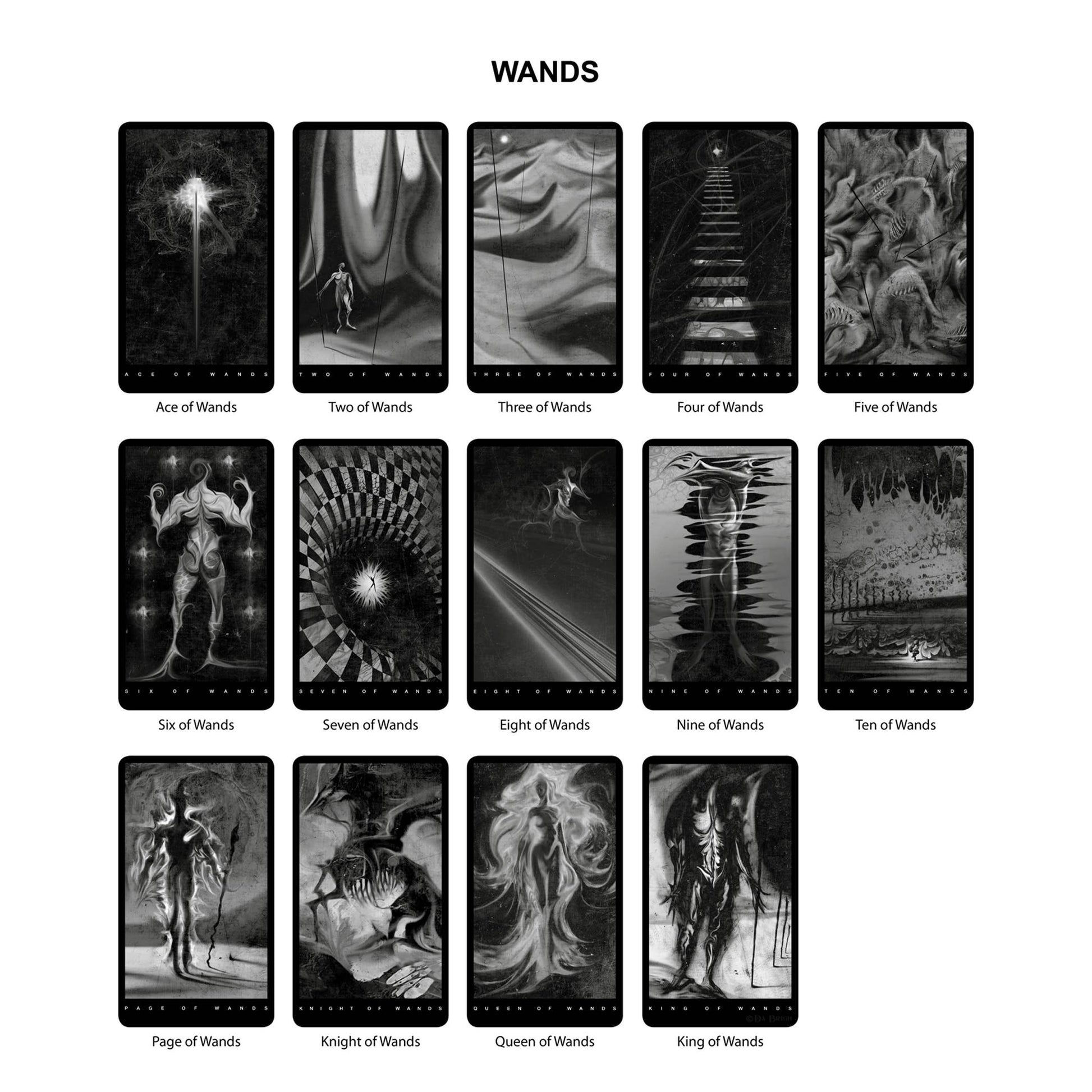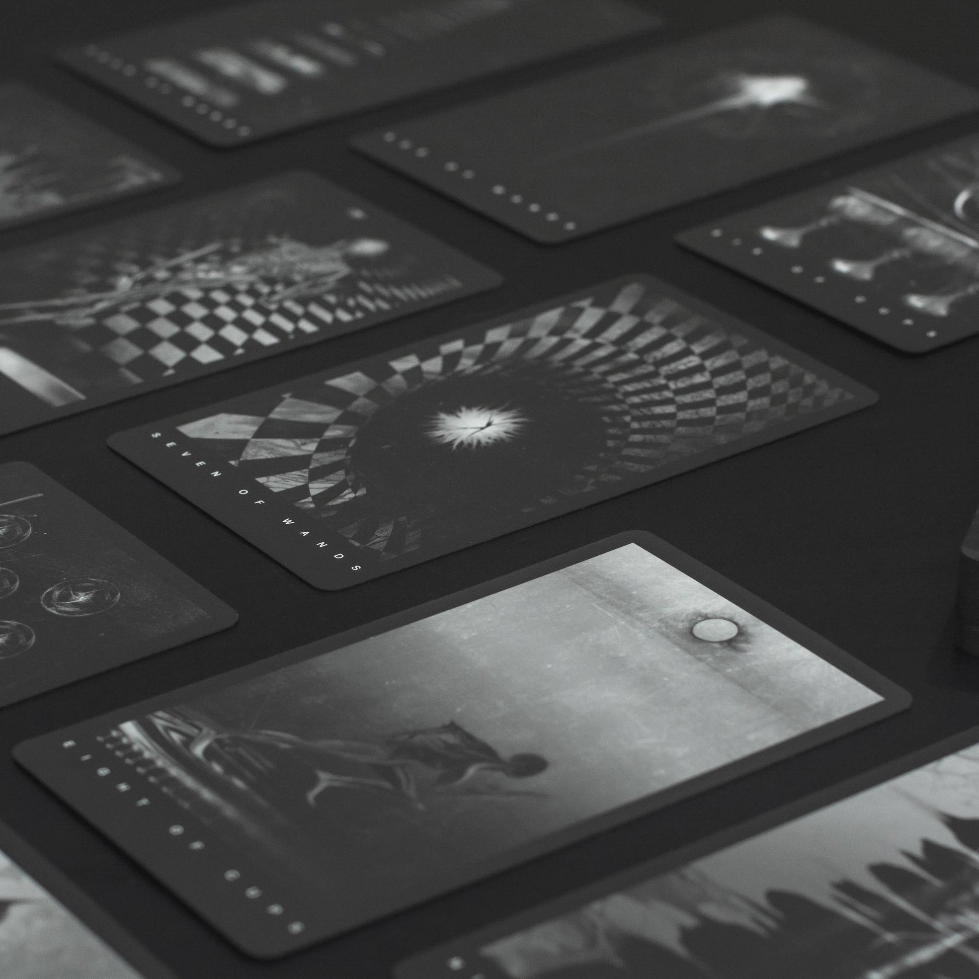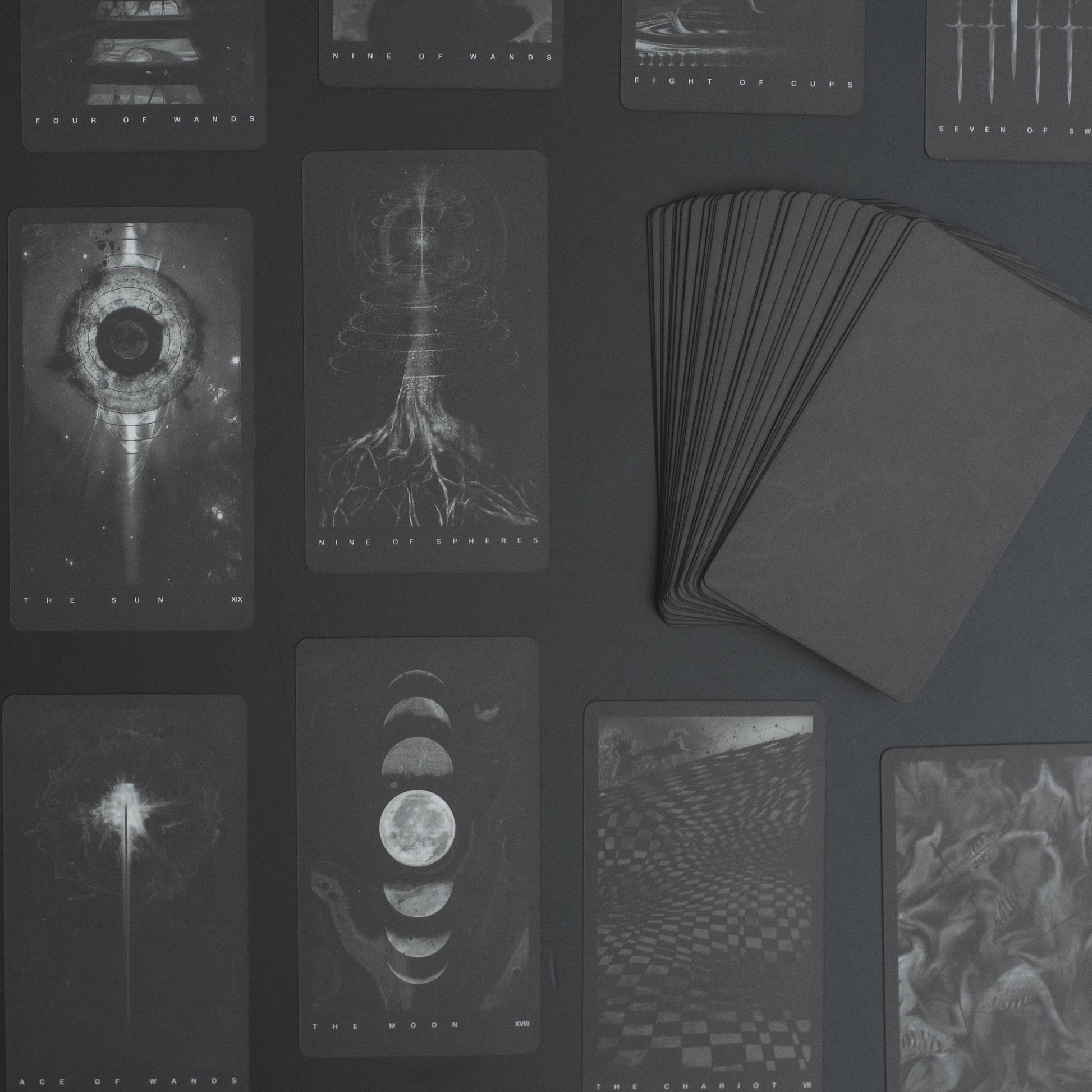 Modern black and white tarot deck with abstract emotional art. Excellent for shadow work. Black card edges.